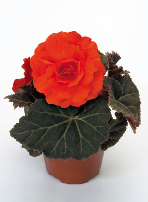 Early lateral branching for premium quality production. Uniform in vigor, habit and flowering. Large, fully double flowers up to 4” . A full color range including bicolors. Nonstop Moccas are the only dark leaved tuberous begnia series on the market.H 10” W 9”