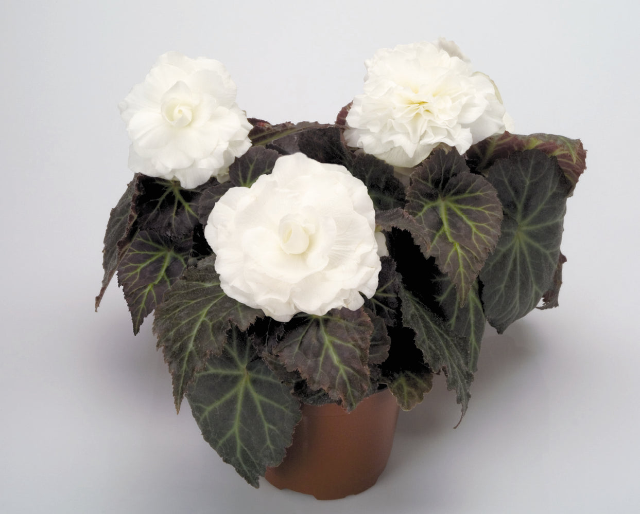 Early lateral branching for premium quality production. Uniform in vigor, habit and flowering. Large, fully double flowers up to 4” . A full color range including bicolors. Nonstop Moccas are the only dark leaved tuberous begnia series on the market.H 10” W 9”