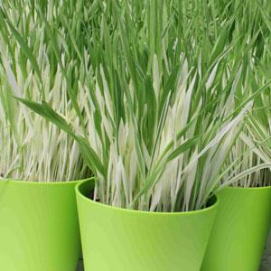 Bright white/green foliage makes an ornamental accent plant for indoor and outdoor containers, as well as an edible treat for both felines and humans. Provides vitamins and fiber for cats and people alike, and has gained popularity as a health “shot” at fitness centers. Will regrow when cut back for additional harvesting. H 12-24" W 10-12"