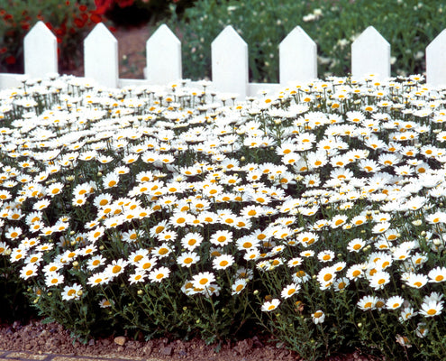 Snowland is a paludosum type Chrysanthemum. It thrives in warm temperatures and long days, covering itself in clear white daisy-like flowers with yellow disks. Uniform, with flowers that are larger than most paludosum types. Outstanding garden performance. H 8-10"