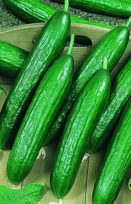52 Days. F1 hybrid, parthenocarpic and gynoecious, dual-use slicing or pickling cucumber. Resistant to Cucumber Mosaic Virus, Cucumber Vein Yellowing Virus, Downy Mildew, and Powdery Mildew. Medium green exterior with very small black spines, 5-8" long. a Mediterranean-type cucumber that is burpless with few seeds, featuring tender skin and a mild flavor. H 18-30"