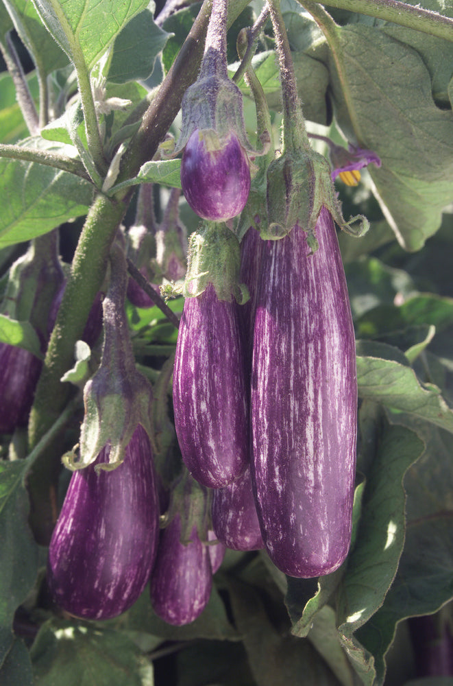 F1 hybrid. Early-maturing, highly productive variety produces clusters of attractive white fruit with violet/purple stripes. Elongated tear-drop shaped fruit are sweet and non-bitter, with a tender skin and few seeds. Fruit can be harvested when very small or left on the plant until fully mature. Petite plant habit between 18 to 24” is perfect for growing in containers or small-space gardens, with or without support. All-America Selections National Winner.