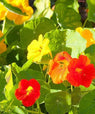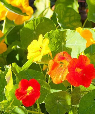 This flower variety has variegated foliage when grown to maturity, and produces edible flowers in a mix of yellow, cherry, salmon, and crimson. ~225 seeds/oz H 12-18"