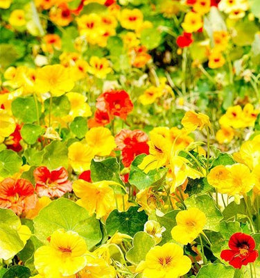 Whirlybird Nasturtium flower garden seeds. Annual Flower. Edible Flowers. This strain boasts a better range of flower colors when grown on to maturity. Edible flowers include scarlet, pale yellow, soft peach, gold tangerine, and cherry rose. H 14"