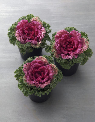 Kamome is a hybrid finged-leaf Flowering Kale. Perfect for fall and winter gardens, it adds color, texture and interest to both landscapes and containers. An ideal season extender as it tolerates frosts and light freezes, and a bonus is cool night temperatures bring out its color. Plants are 8 to 12" high, 12 to 14" wide.