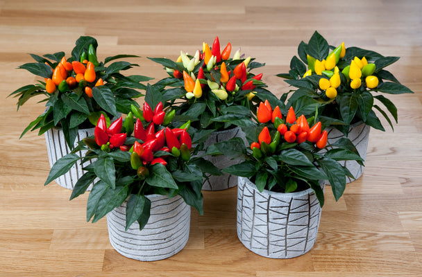 Well-branched, compact plant without PGRs. Produces many bright-colored fruits. Long-lasting color from non-edible, ornamental peppers. Excellent uniformity and indoor/outdoor performance. H 6" W 4"