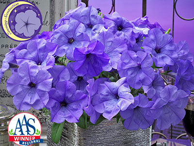 Petunia F1 Evening Scentsation is a 2017 AAS award winner. A medium-sized multiflora type with a low, spreading habit it reaches a height of 5 to 8 inches, and a width of 30 to 36 inches. Its flowers have a scent similar to Hyacinth with notes of Rose and Honey. Blooms, that cover the plant, are in clear shades of indigo.
