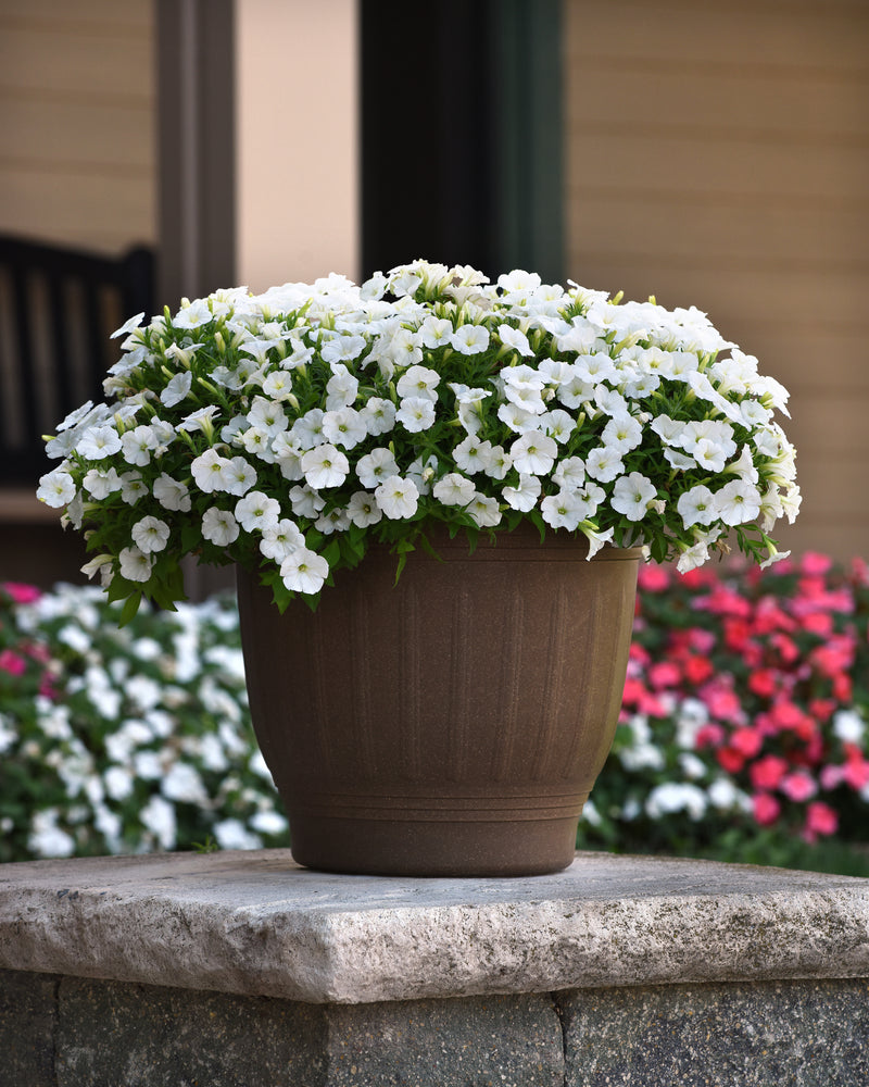 Each Shock Wave plant is blanketed with masses of color from the amazing number of petite, high-impact flowers. Blooms in a 4 to 6-day window. Smaller blooms rebound faster from overhead watering and rain than other petunias – stays fresher-looking at retail and outdoors. Performs equally well in small spaces, baskets, containers and mixed combos. Recommended in 4” pots, premium quarts, 306 premium packs with handle, hanging baskets. H 7-10” W 20-30”