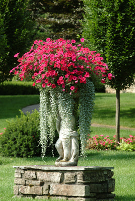 Largest and most vigorous of the Wave petunia family, Tidal Wave plants provide super-size color in big spaces, and are suitable for large city baskets and plantings. Excellent landscape performer with terrific recovery from rain. Unlike other petunias, Tidal Waves stay together. Height, spread and spacing: Growth habit is based on how closely plants are placed – the closer the spacing, the taller the plants. Spaced a minimum of 12” apart, Tidal Wave petunias form a dense, mounded hedge, 16 to 22” tall. Grown in a restricted space with support, they grow an extra 2 to 3 ft upward, like a vine. Spaced up to 24” apart in the garden, the plants make a floriferous groundcover, spreading up to 5 ft across per plant. Recommended in: 8” pots.