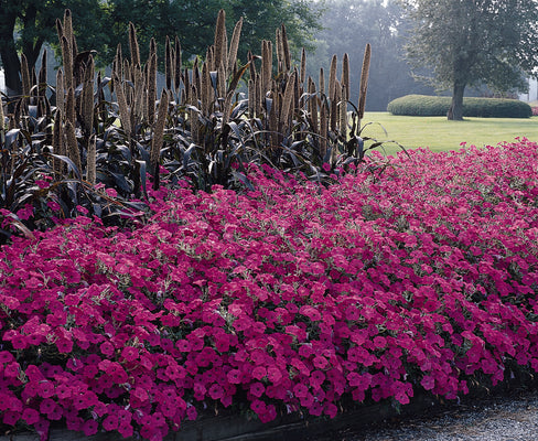 Largest and most vigorous of the Wave petunia family, Tidal Wave plants provide super-size color in big spaces, and are suitable for large city baskets and plantings. Excellent landscape performer with terrific recovery from rain. Unlike other petunias, Tidal Waves stay together. Height, spread and spacing: Growth habit is based on how closely plants are placed – the closer the spacing, the taller the plants. Spaced a minimum of 12” apart, Tidal Wave petunias form a dense, mounded hedge, 16 to 22” tall. Grown in a restricted space with support, they grow an extra 2 to 3 ft upward, like a vine. Spaced up to 24” apart in the garden, the plants make a floriferous groundcover, spreading up to 5 ft across per plant. Recommended in: 8” pots.