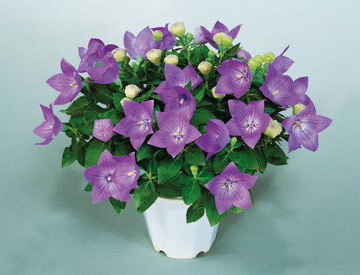 Sentimental Blue is a genetically dwarf platycodon selection featuring puffy flower buds shaped like balloons, which open into 3” diameter, single, blue, upward-facing, bell-shaped flowers. Superior basal branching, mounding habit and pointed, cup-shaped multi-blooms in a beautiful mid blue color encourage this platycodon to bloom most of the summer. With its heavy bud count and early flowering energy Sentimental Blue can be sold as a bedding plant or pot crop and then planted in the garden where in some areas it becomes a perennial. H 5” W 8”