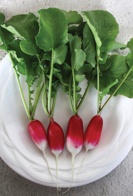 French Breakfast features a cylindrical root, two to three inches in length. The root is 2/3 scarlet with a white tip. The mild flavor and early/mid maturity make this a favorite in its class.