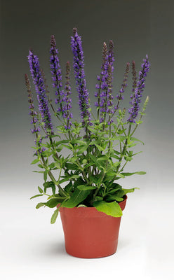 A dense, clumping habit, violet blue flower petals unfold on upright flower spikes. What makes this Salvia even more unique are the large number of vibrant blue flowers that occur the first year from seed. A dense branching habit and multiple flower stems offer a vast array of color from May through June. Flowering early the first year without vernalization, Adora offers growers quick and economical production. Fits in with annual production in the early spring, and also with traditional flowering perennial production for the later summer months. H 14”