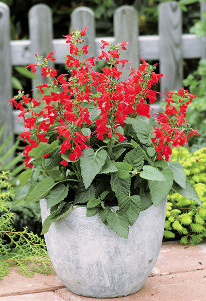 Hummingbird is a Salvia coccinea series that include well known varieties such as Lady in Red and Snow Nymph. The series has a long blooming time. Plants are well branched with numerous flower spikes and are magnets for hummingbirds and other pollinators. Lady in Red is an AAS winner. H 14-24"