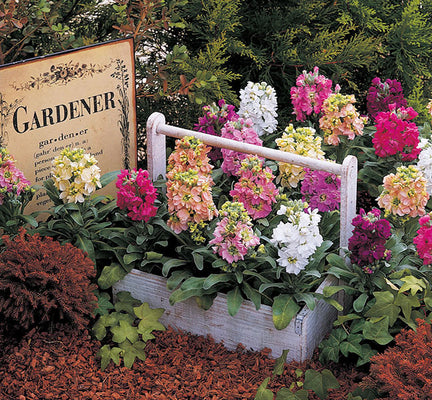 Cinderella is a dwarf Matthiola series which is selectable for doubleness. Seedlings are easily distinguished as doubles after they are exposed to cold temperatures below 46°F (8°C) with light. Doubles show pale green cotyledons and singles show dark green cotyledons. H 9"